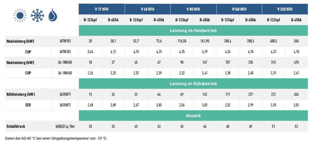 - Maschinen mit R-1234yf bieten 20 bis 400 kW und Maschinen mit R-455A 30 bis 560 kW, je nach der unten getroffenen Auswahl. Diese Daten entsprechen den vorgeschriebenen Tests.
